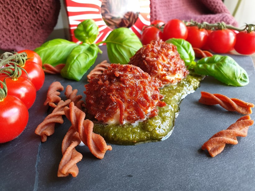 - Auf einem Teller einen Klecks Pesto geben und darauf die Bällchen drapieren.