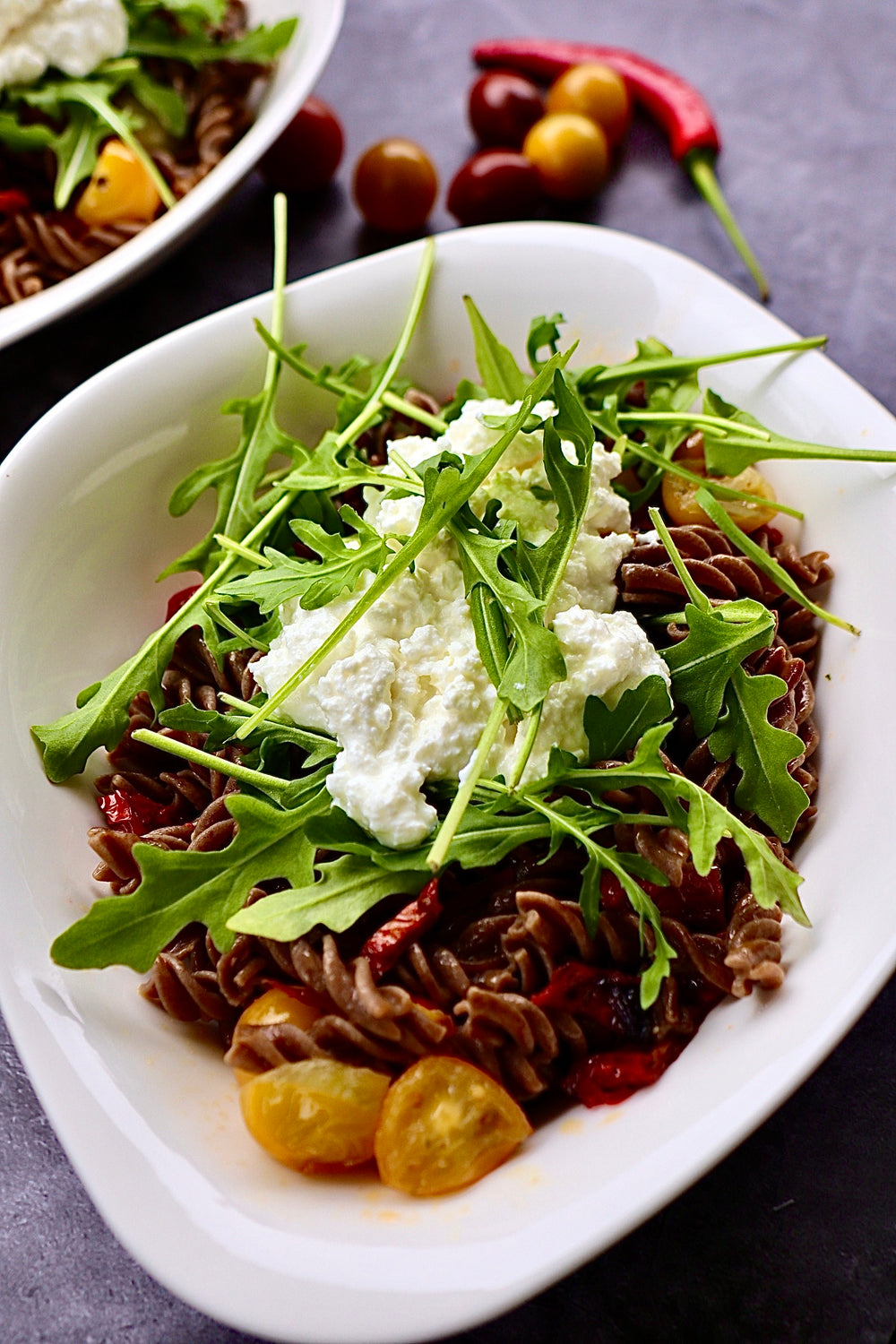- Die Pasta abgießen, unterheben und mit Rucola und körnigem Frischkäse anrichten.