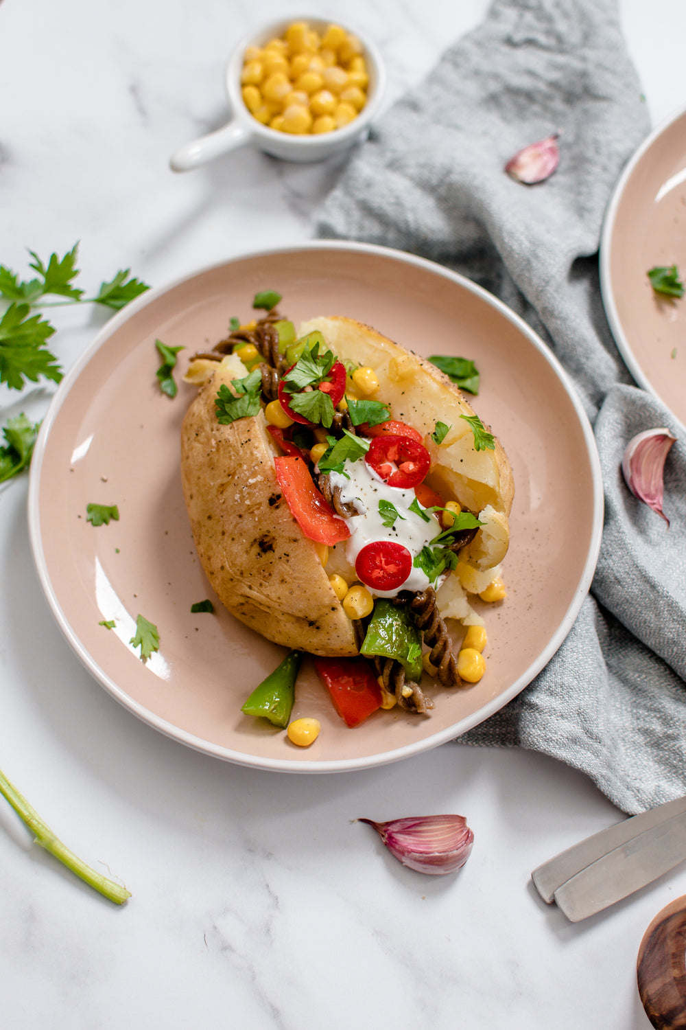 - Die Kartoffeln bei 180 Grad für 1h 30min im Ofen backen. In der Zwischenzeit unsere Proteinpasta nach Packungsanleitung kochen.