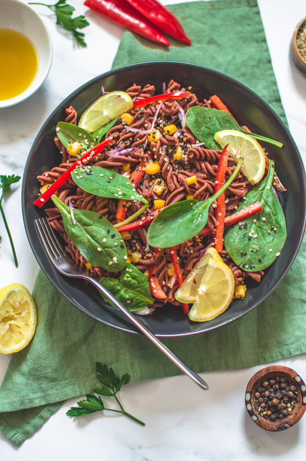 - Die abgekochte Pasta mit dem Olivenöl, Salz und Pfeffer mischen.