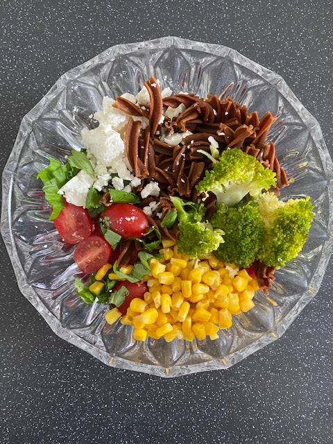 - Die Nudeln auf einem Teller anrichten und mit dem Gemüse garnieren. Nach Belieben mit Pesto verfeinern.