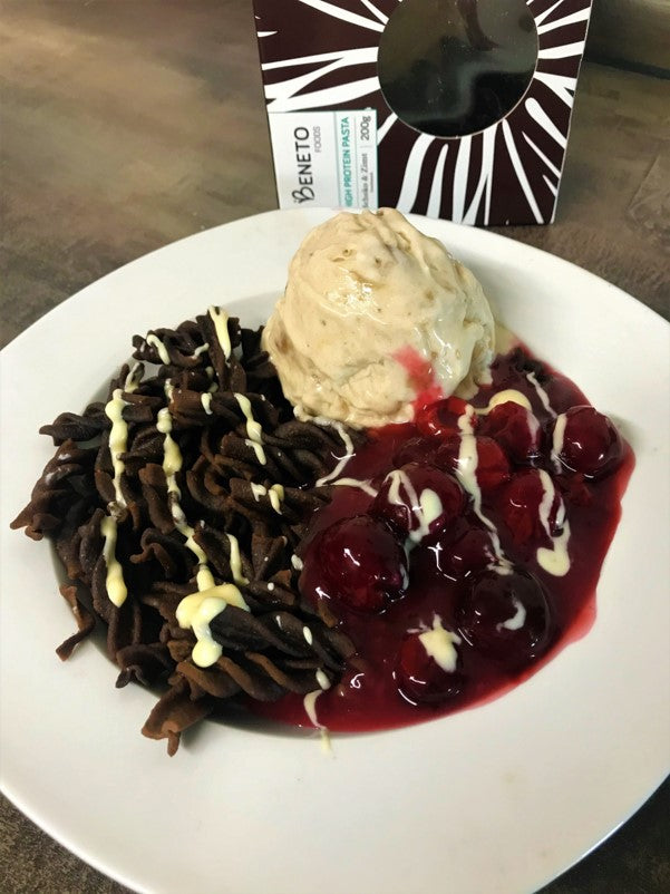 Süße Schokopasta mit Nice Cream und heißen Kirschen